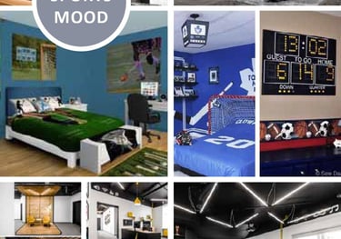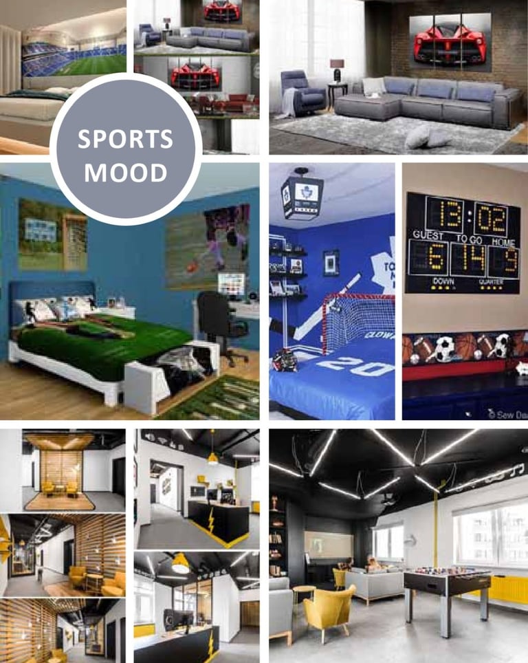 Dynamic and energetic, incorporating bold accents, functional layouts, and design elements inspired by movement and strength.